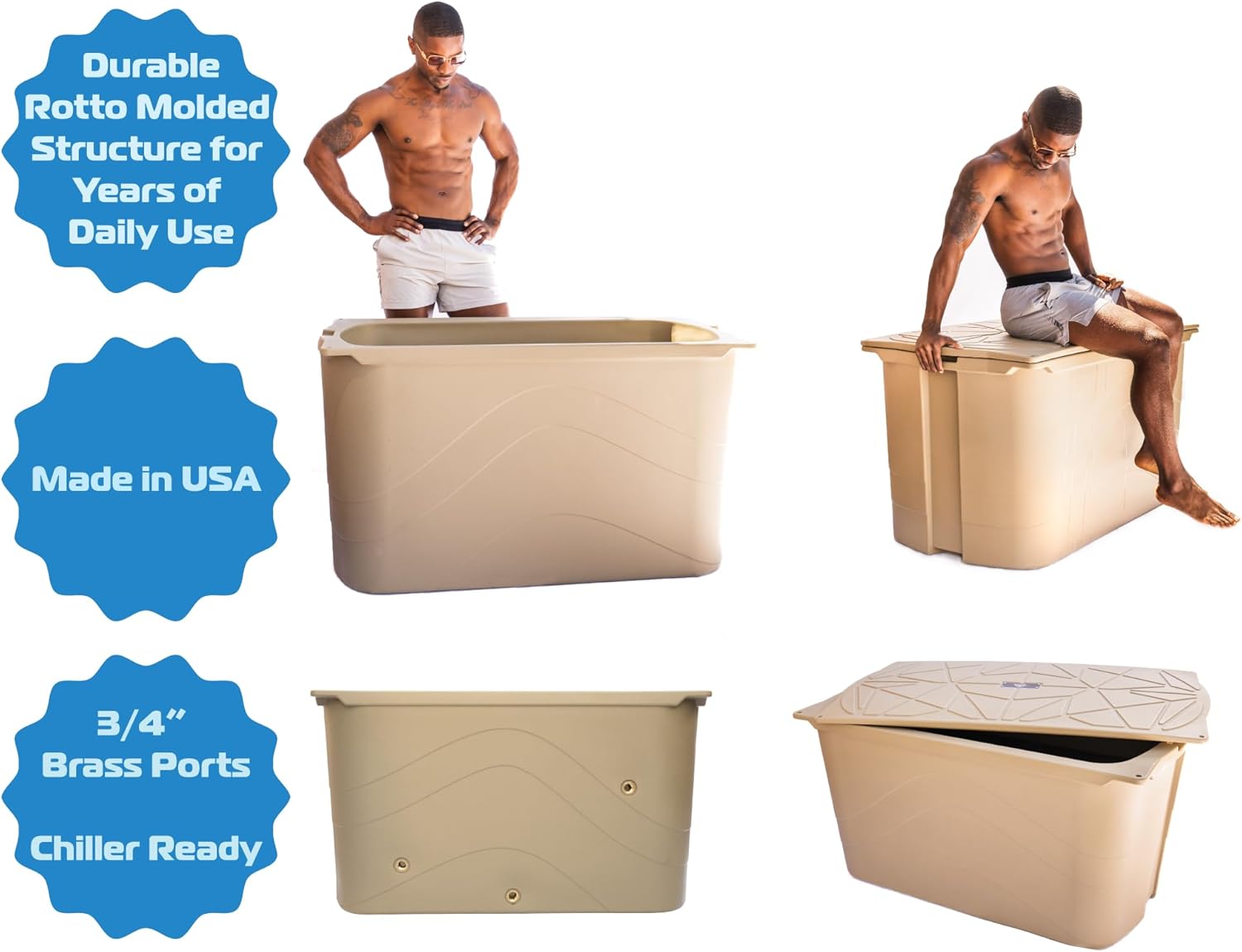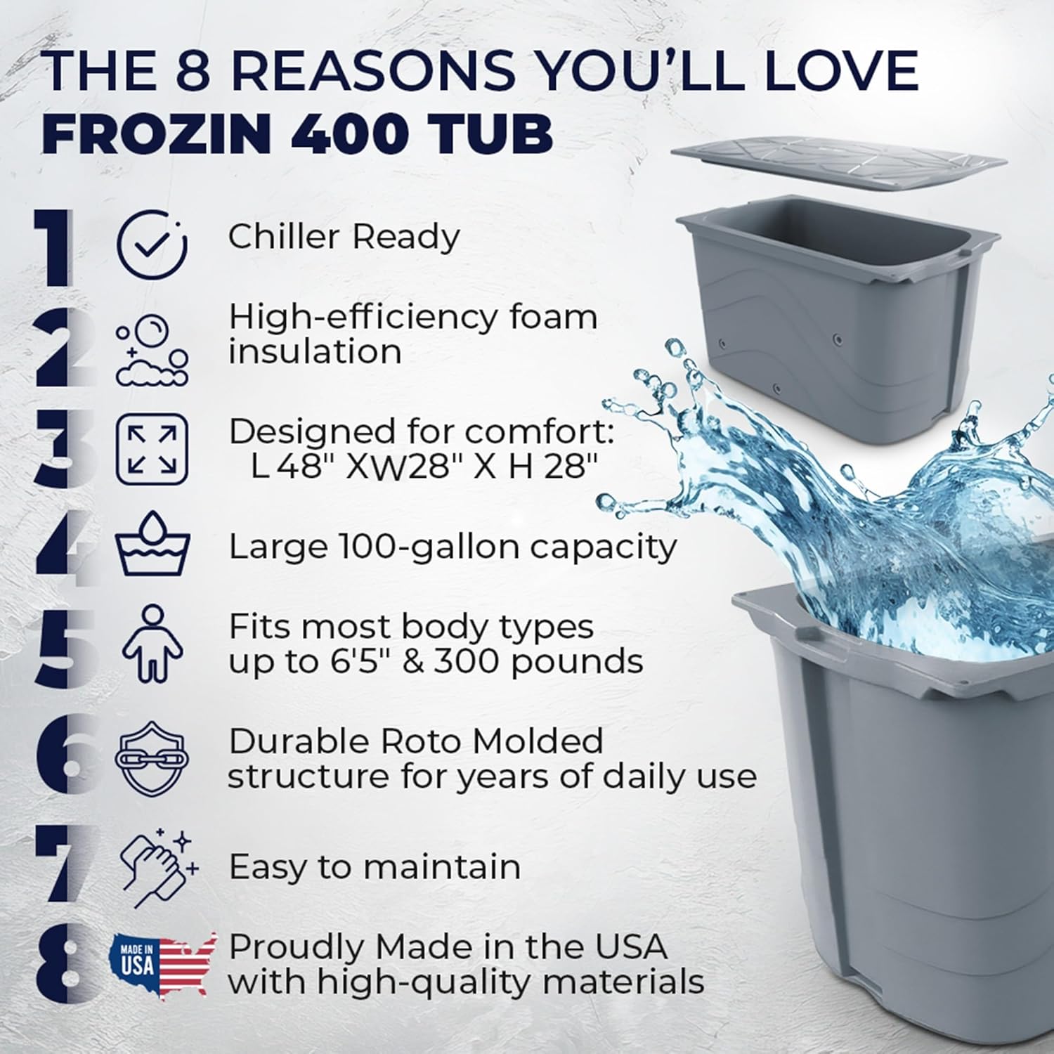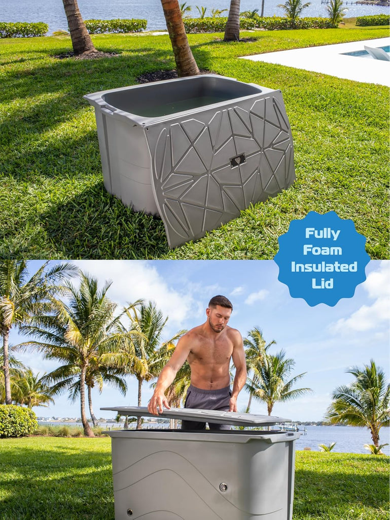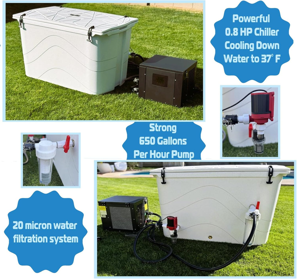 Introducing the ICE SMITH 400 Cold Plunge Tub, your ultimate solution for a superior daily plunge. Chiller Ready, with its high-efficiency insulation, this tub ensures superior ice water retention for extended periods. Designed for comfort and convenience, the ICE SMITH tub boasts a large 400-quart (100-gallon) capacity, making it perfect for individuals up to 6'3" tall and weighing up to 300 pounds. Say goodbye to smaller capacity uninsulated barrel of ice or inflatable ice baths offers superior comfort and performance. Despite its large capacity, the ICE SMITH tub remains compact with maximum dimensions of 48 by 28 by 28 inches. This makes it ideal for use in the garage, gym, garden, or outdoors, allowing you to enjoy a refreshing soak wherever you are. Crafted with durability in mind, the ICE SMITH tub is proudly made in the USA with high-quality materials. Its fully foam insulated and  Molded structure ensures years of normal daily use, whether you're using it in the morning, afternoon, or evening. Versatile in use, the ICE SMITH tub is perfect for Sports Training Recovery, post-workout relaxation, and Pain Relief Soaks. It's the perfect addition to your everyday morning routine, suitable for use by your husband, wife, son, daughter, or even a grizzly bear! Easy to maintain, the ICE SMITH 400 Cold Plunge Tub is designed for hassle-free cleaning and maintenance, making it a perfect addition to your home or gym. Experience superior cooling, comfort, and convenience with the ICE SMITH tub. Chiller With Powerful 1.0 HP Cooling down water to 37 F. 20 micron water filtration system and Strong 650 Gallons Per Hour Pump With all Chiller orders